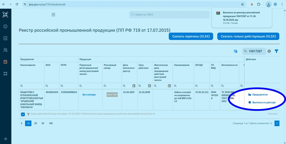 3. система выдаст строку искомой позиции с указанием производителя, марки и дополнительных сведений о продукции. В крайнем правом столбце необходимо нажать на «Выписка из реестра».