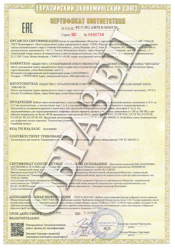 Кабель для структурированных кабельных систем (СКС) на основе витой пары с медными токопроводящими жилами для внутренней прокладки